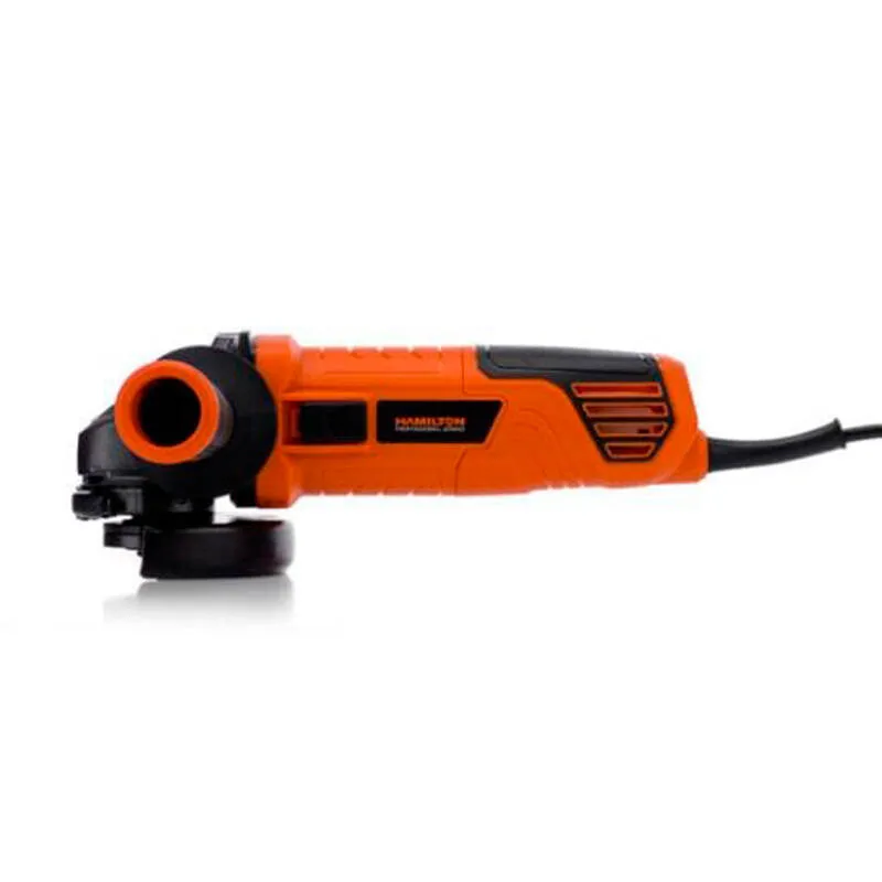 Amoladora Hamilton HAA001 de 850W, con velocidad de 12,000 RPM, discos de 115 mm, diseño ligero y ergonómico. Ideal para trabajos en metal, madera y mampostería.