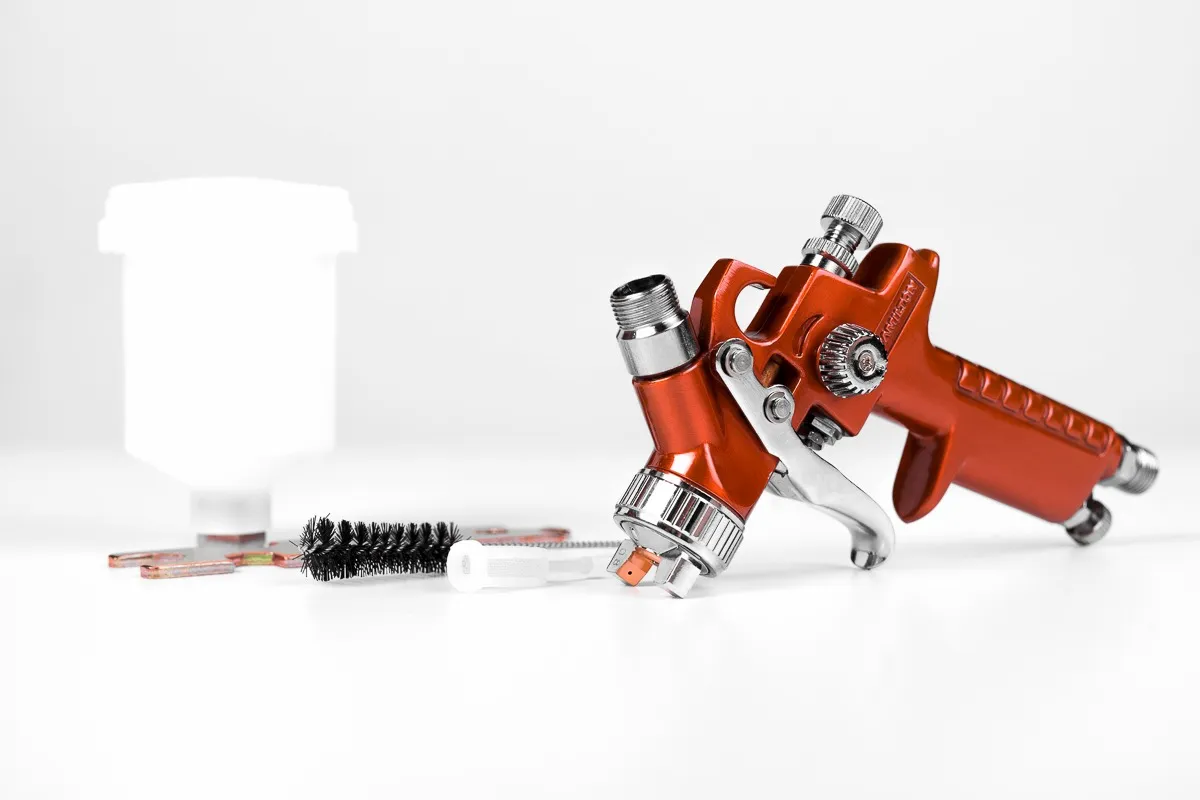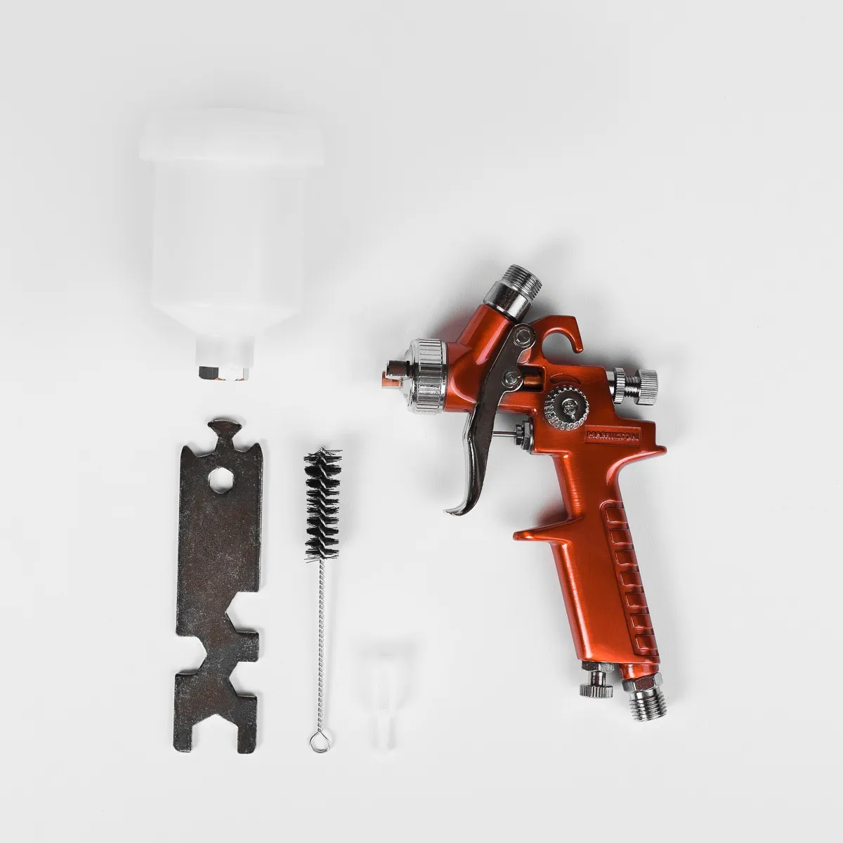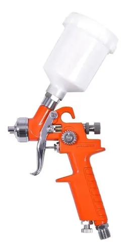 Pistola de pintar por gravedad de aluminio con depósito metálico de 125 cc, pico de 0.8 mm y aguja de acero inoxidable. Resistente, precisa y fácil de mantener.